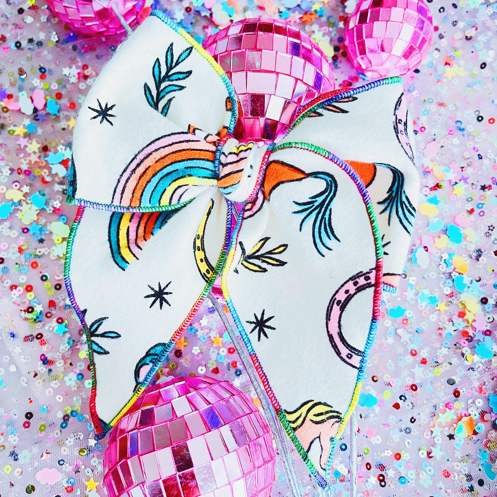 Step into a dreamy world with Misty Magic — a soft, fable hair bow adorned with delicate unicorns and rainbows in muted pastel tones. Designed for everyday whimsy, it’s the perfect blend of comfort and charm, adding a touch of quiet enchantment to any outfit.